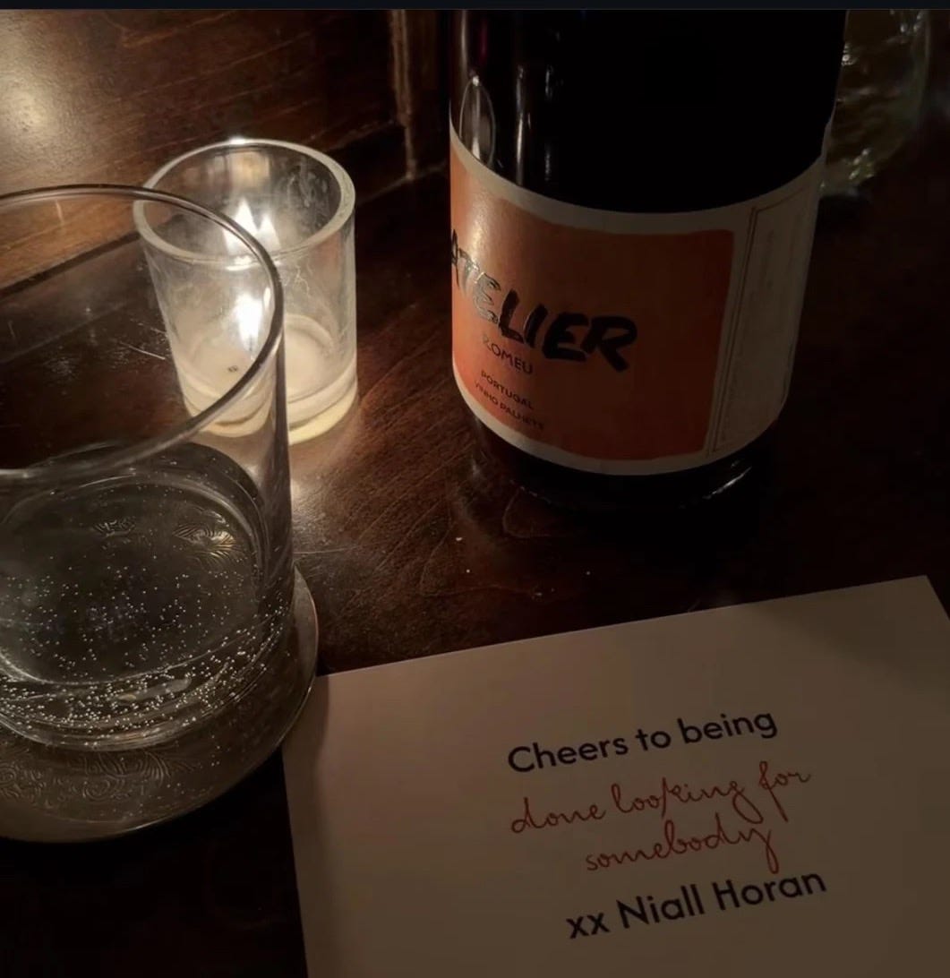 The former One Direction member surprised everyone at Dinner Party in Brooklyn, NY, with a bottle of wine and a note saying “Cheers for being done looking for somebody (handwritten), xx Niall Horan.”